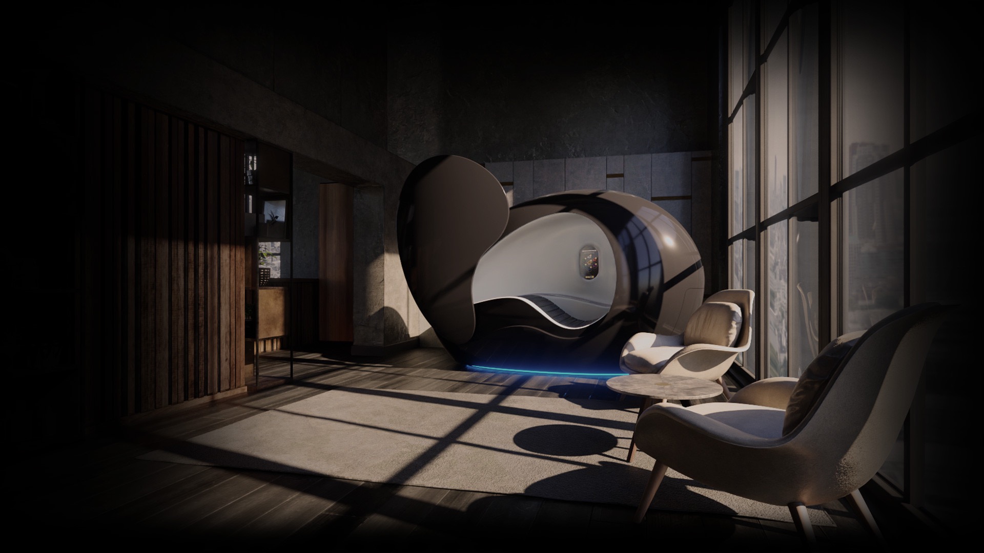 The solution is the Regenesis Pod, an immersive recovery chamber that integrates multiple modalities like light therapy, sound frequencies, pulsed electromagnetic fields (PEMF), aromatherapy, crystal energy, and infrared heat to promote rapid physical and mental rejuvenation. Sessions last 5-30 minutes, allowing users to feel refreshed and recharged quickly.